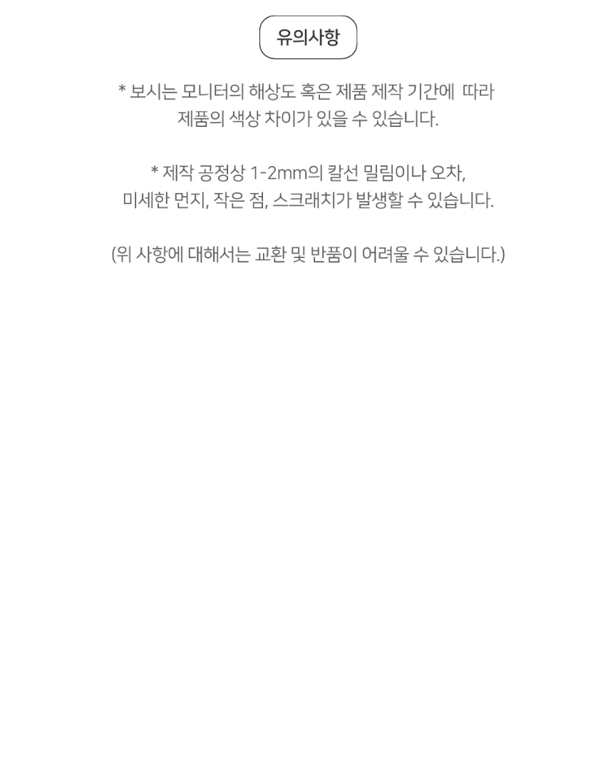 - 단순 변심 또는 고객 부주의로 인한 교환·반품 시 왕복 배송비가 부과됩니다.